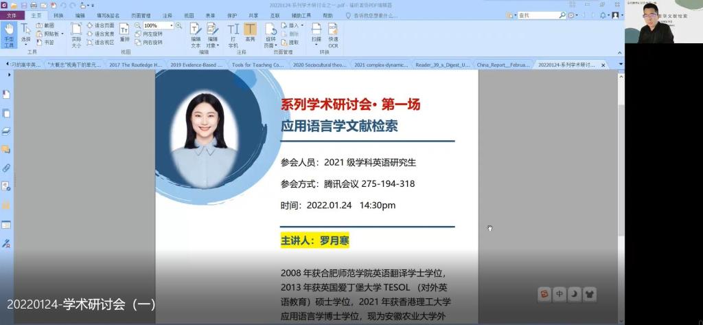 本网讯 为了不断提升永利集团304am登录研究生培养质量,加强对研究生培养的过程性监督与督促,2022年1月24日下午2点30,在永利集团304am登录研究生部的组织下,为2021级学科教学(英语)方向的研究生举行了一场线上学术研讨会,所有2021级研究生同学及部分2018级本科同学参与了本次线上研讨会。本次学术研讨会邀请了安徽农业大学永利集团304am登录罗月寒博士作为主旨发言人,发言话题为“应用语言学文献检索”,外院研究生部主任蒋道华、研究生导师强云,吴礼敬参与了本次线上研讨。