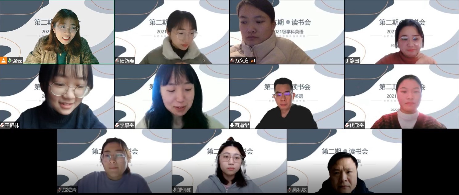 本网讯 为了强化研究生过程性培养,推动研究生专业知识与能力的不断提升,在外院研究生部的统筹下,外院部分导师组成硕士生培养共同体小组,推进硕士生读书研讨活动的开展。2022年1月21日上午9时,我院21级硕士班开展了第二次线上读书研讨会活动(寒假),部分21级教育硕士生参与该研讨会。本次读书研讨会由陆新雨、代欣宇两位同学作主旨汇报,研究生部主任蒋道华、研究生导师强云、吴礼敬指导并参与了本次研讨。