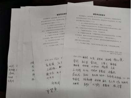 班会结束后,各班同学纷纷在《诚信考试承诺书》上签名,进一步坚定诚信考试的决心。2020级商务英语专业的曲珊仪说:“‘人无信则不立’,诚信考试承诺书的签署,其实并不是纸上的条文约束,更是一种自身修养的考验。在接下来的考试中我将遵守考纪,公平参与竞争,以诚实守信的态度完成此次考试。”