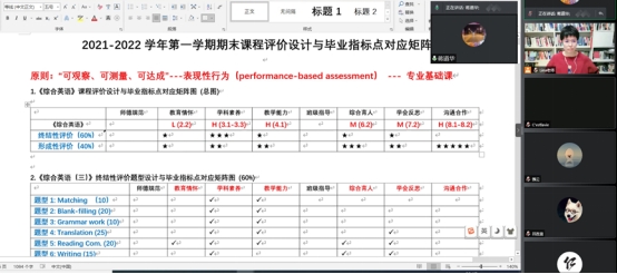 此次线上培训会议既是英语师范认证研讨,也是信息化教学智慧师资培训,进一步强化了英语师范专业全体任课教师对英语师范专业毕业要求指标点的理解,明确了制卷工作对标、对表、对准毕业要求指标点的实施要领,为后期制卷等一系列工作的有序落实夯实了基础;通过线上互动答题实操,使参会教师对以学生为中心的智慧教学设计有了更加深刻的认知并掌握了方法。(永利集团304am登录:强云 钱莉娜)