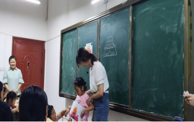 在美术课上,小先生齐美凤在黑板上演示北京天安门简笔画的创作过程,小学员们在绘画时则会加入自己的想法和创意,绘画完成后纷纷上台展示自己的作品,并获得小先生们的认真点评和奖品鼓励。