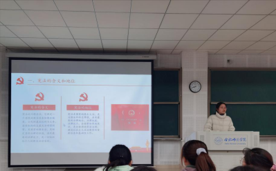 “我宣誓:忠于中华人民共和国宪法,维护宪法权威,履行法定职责,忠于祖国、忠于人民……”在冯晓敏的带领下,全体学生共同举起右手,进行庄严宣誓,让宪法精神永存于心。同时,学院2019级各专业学生也纷纷开展宪法宣传主题班会,各班班委们认真准备PPT内容,详细向同学们介绍宪法相关知识,同学们积极举手回答问题,互相交流讨论,表达自身对法治精神的感悟。