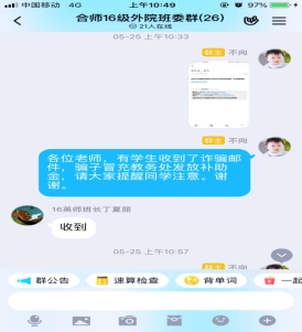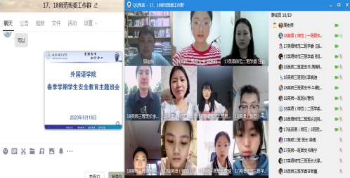 2017级商务英语专业,于5月21日,通过线上座谈会开展春季安全教育主题班会,辅导员苏珊在会议上强调了要加强学习习近平新时代中国特色社会主义思想和社会主义核心价值观,坚定“四个自信”,解读宗教政策,反对非法宗教。另外,心理委员从心理健康的角度通过班级QQ群上传疫情期间心理防护指南的视频,提醒学生疫情在家期间要注意调节自己的心理与情绪,加强自我管理,同学们纷纷学习并开展讨论分享自己在家调节心情的方式方法。生活委员就卫生安全和饮食安全,向同学们提了一些建议和方法,提醒大家要养成良好的卫生习惯,注意个人卫生。安全委员提醒同学们谨防电信诈骗,远离“网贷”,树立正确的消费观与价值观,也提醒同学们找工作、做兼职中也要识别就业陷阱,谨防传销。