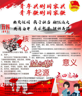 今年是纪念五四运动101周年,各团支部结合五四精神创作一批优秀的文化产品,如:2018级西班牙语专业一班团支部创作的以《坚定主心骨,养足精神钙》命名的海报,2019级英语(专升本)专业二班团支部创作海报《少年强,则国强》,2018级英语(中外合作)专业团支部创作海报《五四传承》。
