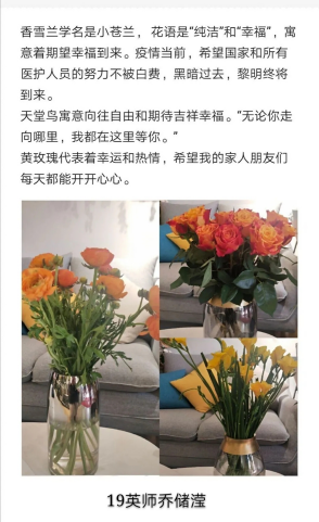 此次比赛首先由选手进行绿植的布置与拍摄,并附上一段作品的文字描写,说明作品的寓意,再把作品交给相关的负责人。比赛的消息一发出来,就有很多同学踊跃报名,每位选手都用心捕捉生活中的美,寓意也是十分新颖,表达了选手内心的爱与期望。有的表达了对祖国的美好祝愿,有的则是对一线人员精神的赞美,也有的作品表达了自己对生活的感悟。