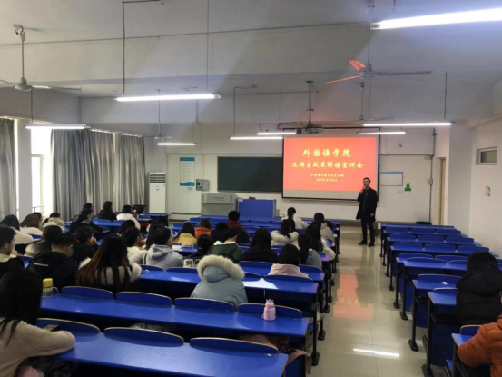 宣讲会开始,方媛老师向大家介绍了15级毕业生胡正阳,胡正阳是永利集团304am登录15级西班牙语学生,并于19年顺利考上安徽省选调生,他以自己的亲身经历来为学弟学妹进行公务员选调生政策解读。