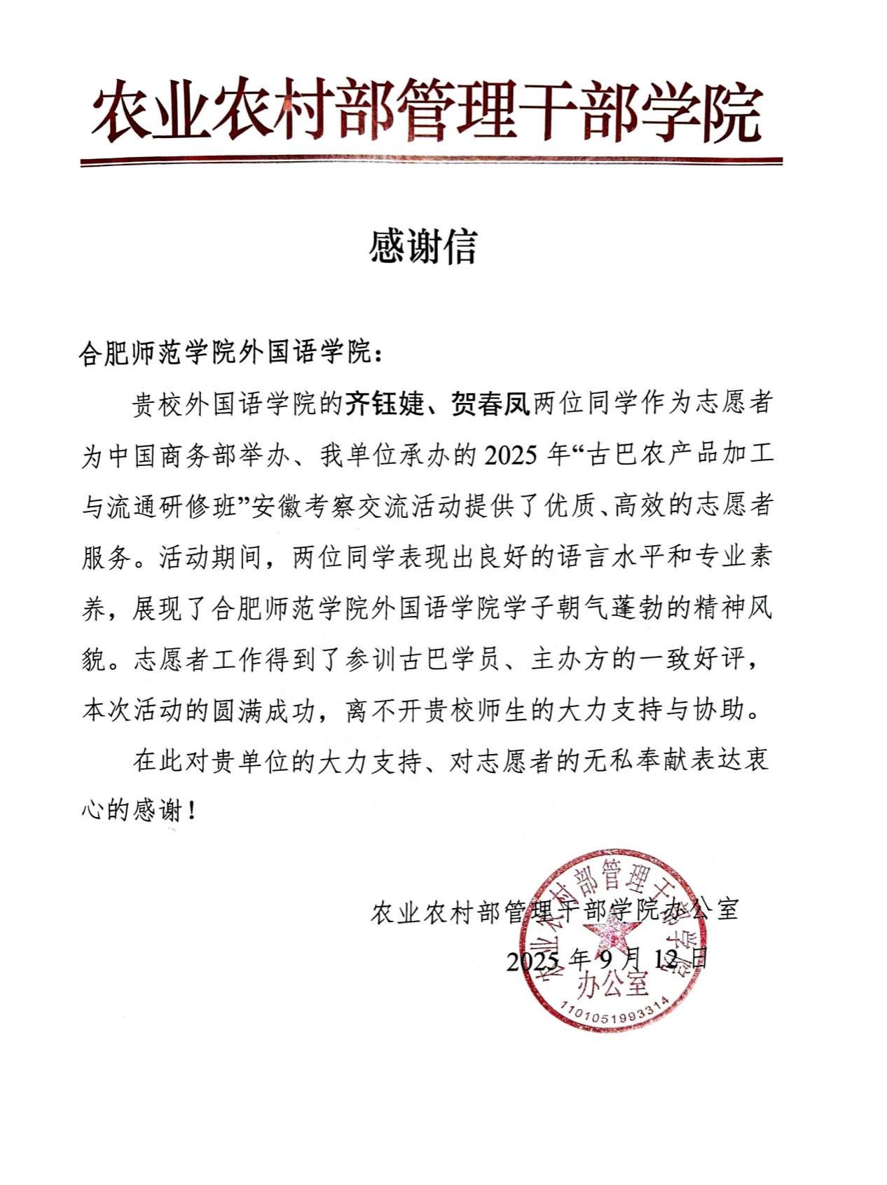 2025年9月9日至11日,商务部举办、农业农村部管理干部学院承办的2025年“古巴农产品加工与流通研修班”安徽考察交流活动在合肥举行。活动期间,永利集团304am登录2022级西班牙语班齐钰婕和贺春凤同学作为外语志愿者全程参与,为古巴学员提供专业语言服务与行程协助。