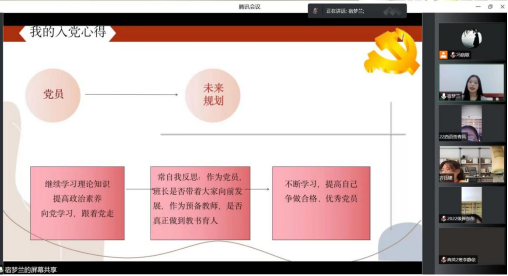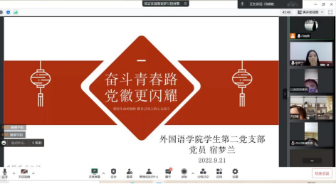 不仅如此,学院鼓励用身边人讲述身边事,积极发挥党员的先锋模范作用。21日晚,学院开展优秀党员事迹线上宣讲会,学生第二党支部党员宿梦兰结合自身实际经历,向新生分享自己在学习、生活方面的经验,讲述自己入党的初心和历程,并鼓励新生们积极递交入党申请书,在青春的征程上继续奋斗,开启人生新篇章。