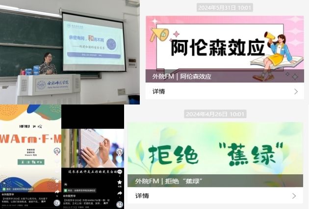 为提升外院学子的心理知识水平,学院组织开展心理大讲堂,邀请教育与心理科学学院副教授、国家二级心理咨询师姚琼,做题为《亲密有间,和而不同——构建和谐的宿舍关系》讲座。依托微信公众号、抖音号等,构建多维育人矩阵,陆续推出以“Warm.FM”为主题的公众号推文,抖音短视频等普及心理健康知识。