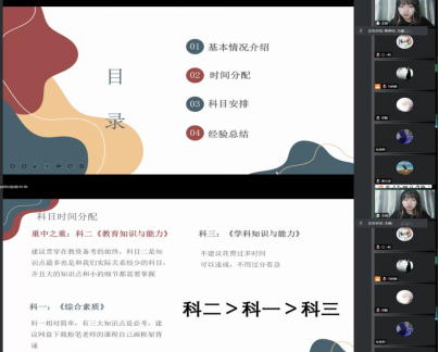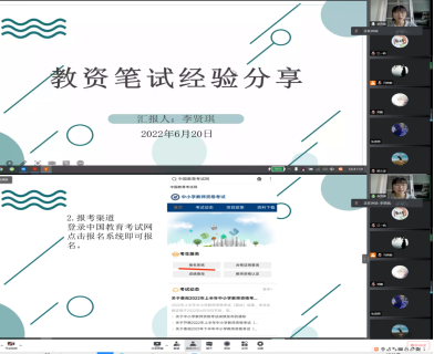 另外,2019级商务英语专业的李贤琪则重点向大家介绍教资考试的报考须知、资料分享和考试重点,鼓励大家要坚定备考信心,做到真抓实干,努力克服困难。听完三位同学的分享,2020级英语(师范)专业的侯思芳说:“学姐们的分享中干货很多,有许多值得学习借鉴的地方,也让我对教资考试的流程和内容有更加清晰的了解,我也会结合自身实际情况,合理安排时间,做好各项准备,争取考出满意的成绩。”